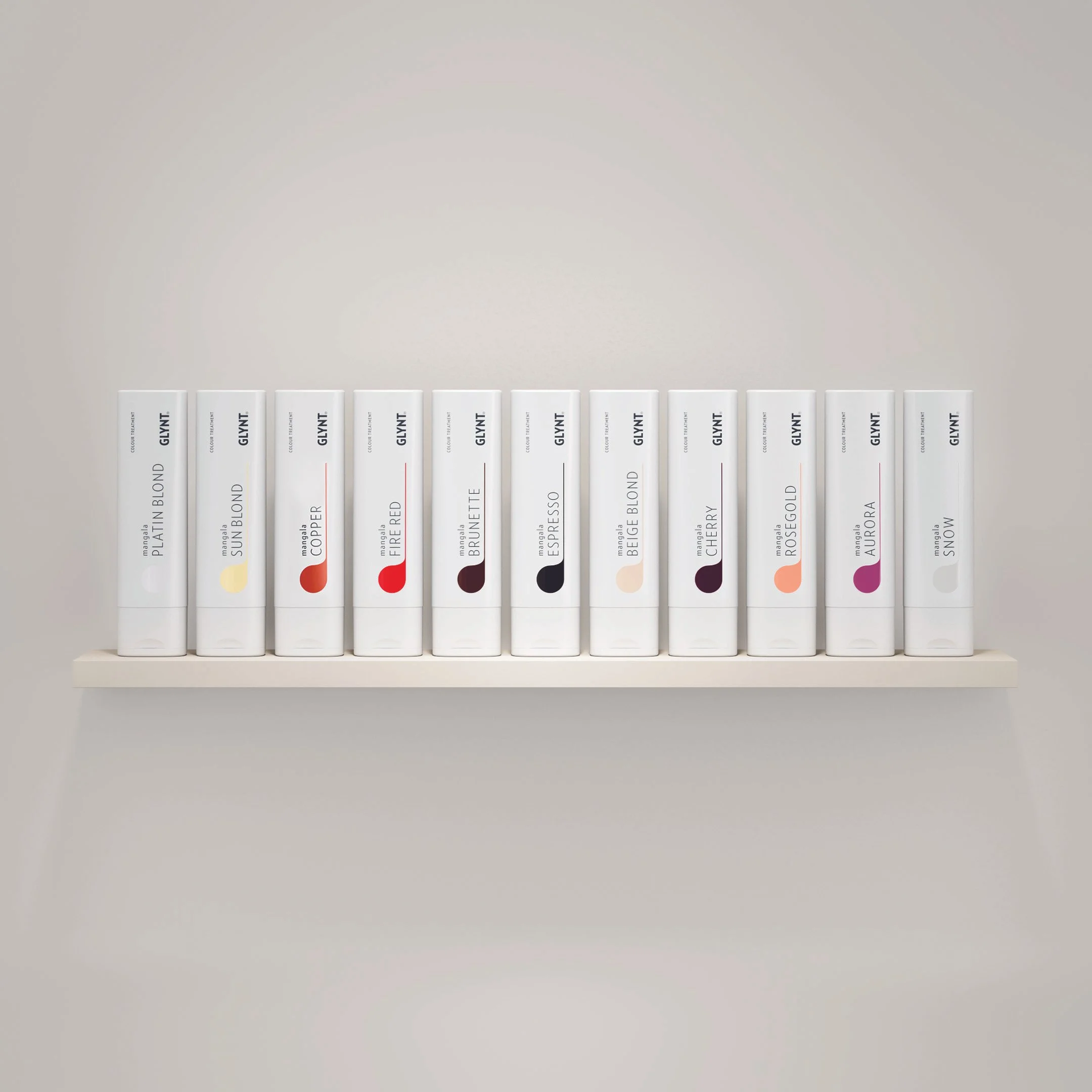 A linha Mangala oferece uma paleta completa de nuances para refrescar, intensificar ou transformar a cor do cabelo de forma prática e cuidada. Entre os tons frios e cristalinos, destacam-se o Snow, que confere um acabamento matte expressivo em cabelos loiros e adiciona profundidade em bases mais escuras, o Platin Blond, perfeito para realçar a clareza dos loiros, e o Sun Blond, que traz reflexos dourados e luminosos. O Beige Blond apresenta-se como um loiro areia elegante com uma subtil nuance rosé, adaptável a diferentes estilos. Para quem procura criatividade e ousadia, há o brilho moderno do Rosegold, a suavidade mágica do Aurora, a intensidade quente do Copper e o impacto vibrante do Fire Red ou do Cherry. Já para os cabelos castanhos, o Brunette valoriza os reflexos naturais e o Espresso garante profundidade e intensidade em bases mais escuras. Cada tom foi desenvolvido para oferecer não apenas cor, mas também luminosidade e vitalidade, criando resultados personalizados e únicos em qualquer tipo de cabelo.